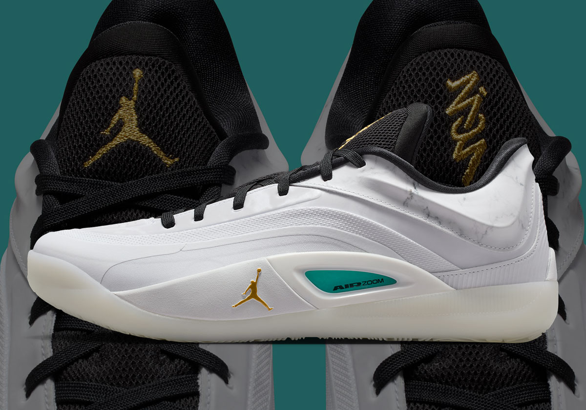 Official images show a crisp white upper accented by a subtle marbled pattern around the collar. Metallic Gold branding celebrates Zion’s success, while Hyper Jade detailing on the Air Zoom cushioning window ties back to the earlier marble-themed design. The tongue and lining come in black, while a semi-translucent outsole polishes up the delivery underfoot.