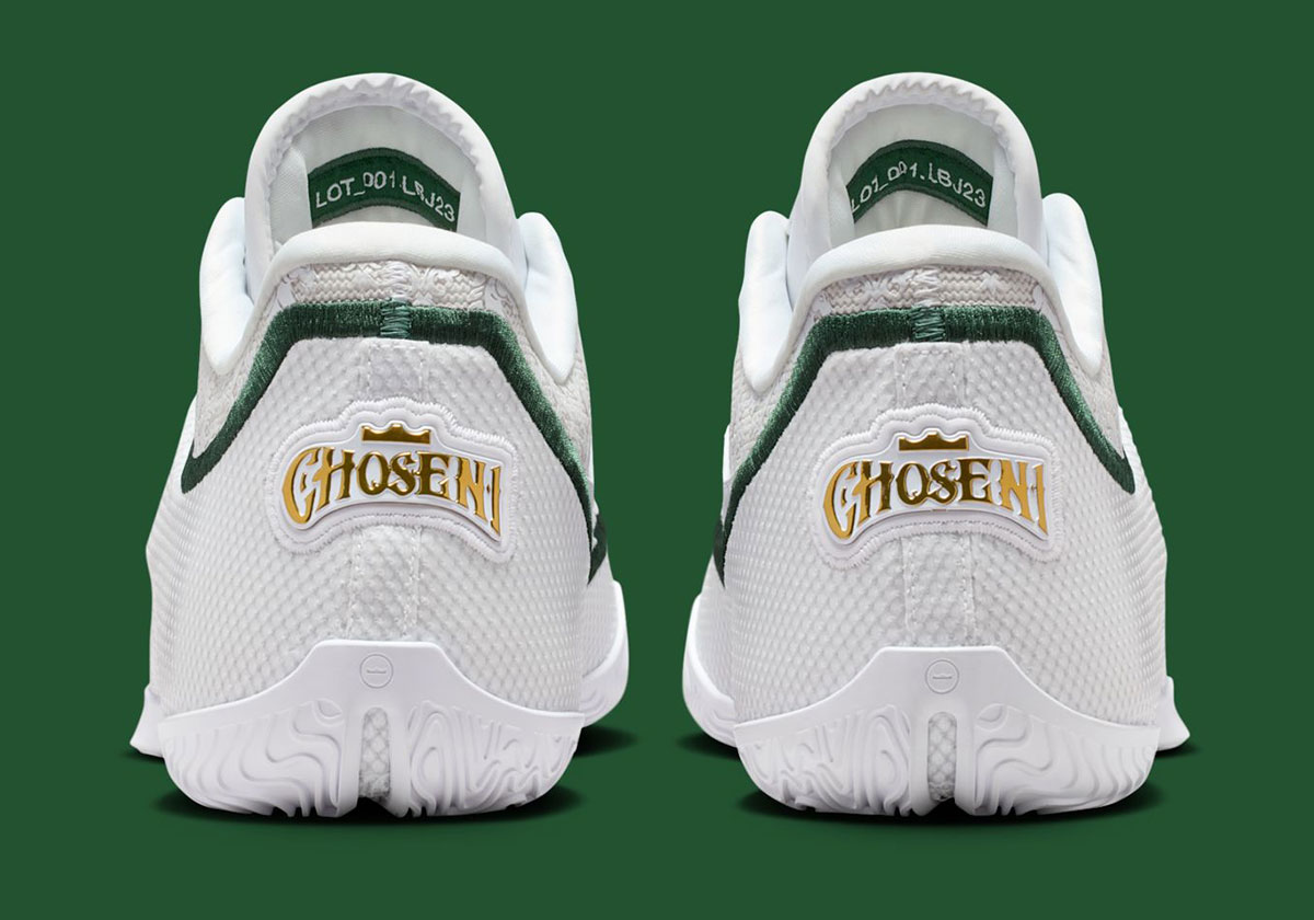 The sneaker matches the uniforms of LeBron’s St. Vincent–St. Mary High School, built on a mostly white foundation with green piping and gold accents. The upper portion features an intricate pattern containing knight chess pieces, nodding to LeBron’s “Four Horsemen” inner circle of Maverick Carter, Rich Paul, and Randy Mims, as well as his player edition Air Force 1 from 2003. Most importantly, the heel features a gold emblem reading “Chosen 1,” directly referencing the aforementioned Sports Illustrated cover. A premium crown-inspired shoebox is included, as are white and green laces.