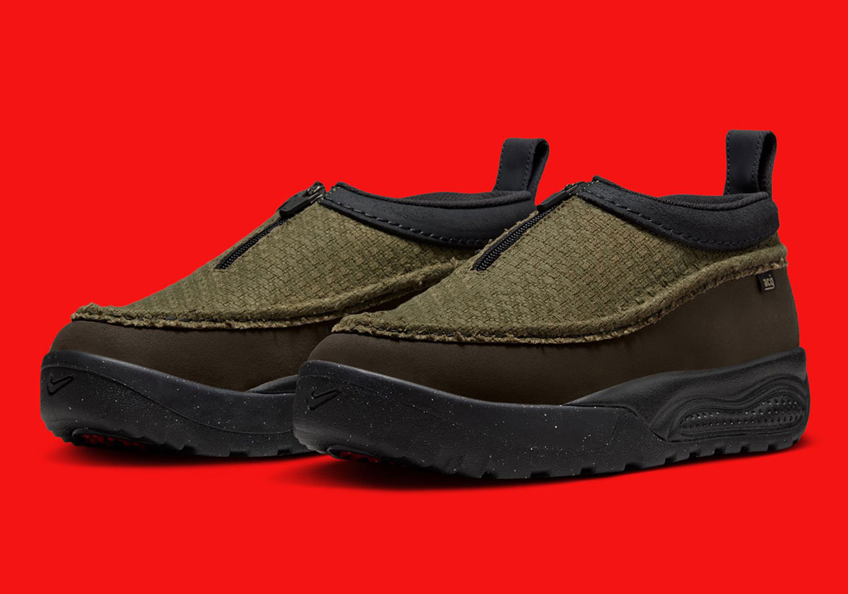 Next up for the moccasin-inspired outdoor shoe is a fresh style featuring a woven Medium Olive upper, marking the first time the Izy has moved away from its all-suede construction during its renewed run. The mudguard is built from Dark Chocolate suede, while cracked black leather wraps the collar. The midsole (shared with the ACG Rufus) comes in Off Noir, and the outsole reveals a bright red interior for a welcome pop of color.
