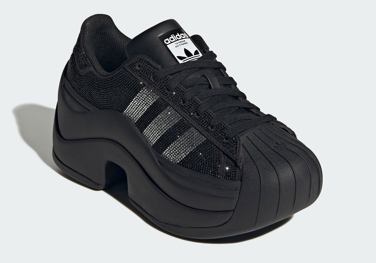 As the year-long fixation on the adidas Superstar marches on, the shell-toe silhouette is the latest to enter that product family. In contrast to some of the aforementioned takes on the concept, the adidas Superstar Bold doesn’t simply multiply its sole unit to achieve statement height. Instead, it’s a brand new segmented platform that affixes onto the base composition, pasted atop the usual cup sole with wavy contours and a TPU build, extending through that iconic toebox. To bolster its new hardware choices, the uppers shift into bedazzled territory, offering glimmering detailing within the bounds of the classic white-on-black colorway.