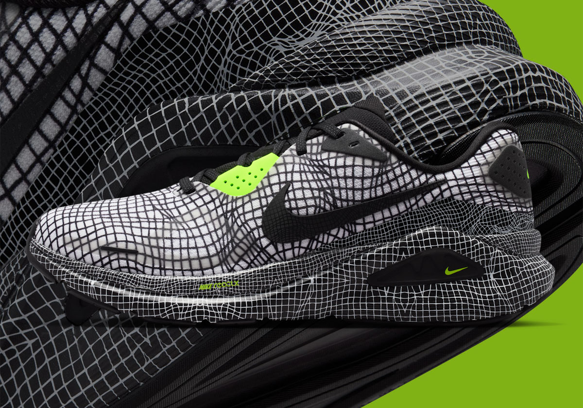 In a creative flip on usual white/black fare, that array in the upper inverts coloring within the sole and mudguard. To cement the digital inspo for this pair, Nike’s patented “Volt” peers through in various branding hits before entirely enveloping the insoles.
